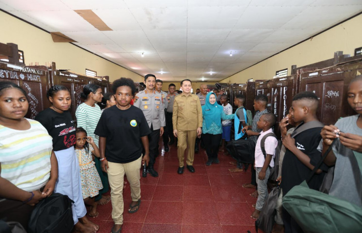 Penjabat (Pj) Gubernur Papua Agus Fatoni bersama Pj. Ketua TP PKK Tyas A. Fatoni mengunjungi anak-anak Panti Asuhan Pembawa Terang Holtekamp yang saat ini sementara menempati asrama SPN Polda Papua, Jayapura, Senin (6/10/2025).