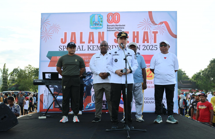Penjabat (Pj) Gubernur Agus Fatoni melepas ribuan peserta Jalan Sehat dalam rangka menyambut Hari Ulang Tahun Kemerdekaan Republik Indonesia (HUT RI) ke-80. Kegiatan ini berlangsung di Lapangan Gelanggang Remaja Biak, Kabupaten Biak Numfor, Papua, Sabtu (02/08/2025).