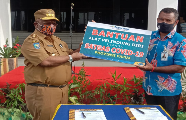 Bank Pembangunan Daerah (BPD) Papua menyerahkan bantuan 100 paket alat kesehatan (alkes) untuk penanganan Covid-19, yang diterima Wakil Gubernur Klemen Tinal, Senin (6/7/2020), di Halaman Kantor Gubernur Dok II, Jayapura.