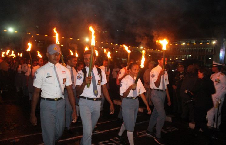 Jelang perayaan upacara bendera di Stadion Mandala Jayapura, Anggota Pasukan Kibar Bendera (Paskibra) 2017 mengikuti malam Taptu dan renungan suci sebelum dikukuhkan oleh Gubernur Papua di Halaman Kantor Gubernur Dok II Jayapura, Rabu (16/8) sekitar pukul 19:00 WIT.