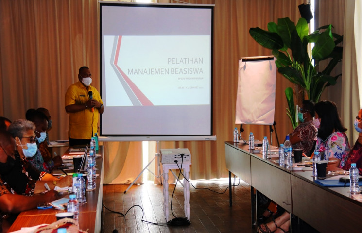 Pemerintah Provinsi (Pemprov) Papua melalui Badan Pengembangan Sumber Daya Manusia (BPSDM) Provinsi Papua bekerjasama dengan Kementerian Perencanaan Pembangunan Nasional/Badan Perencanaan Pembangunan Nasional (Kementerian PPN/Bappenas), Kementerian Pendidikan dan Kebudayaan (Kemendikbud) dan Kementerian Keuangan (Kemenkue) Republik Indonesia, Kamis pagi (4/3/2021) menggelar Pelatihan Manajemen Beasiswa bagi Pegawai Negeri Sipil (PNS), bertempat di Hotel Morissey, Jakarta.
