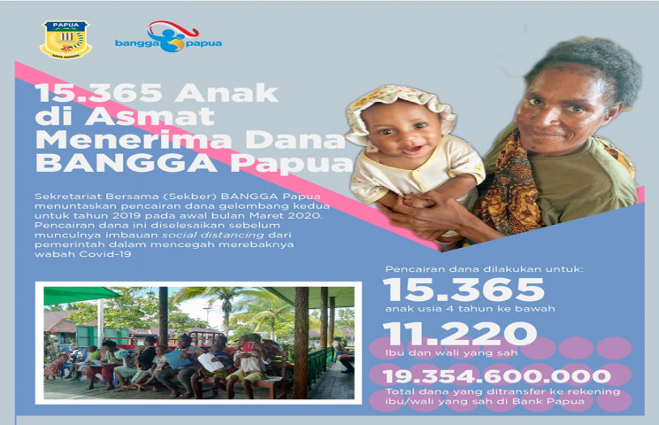 15.365 anak penerima manfaat program BANGGAPapua di Kab. Asmat menerima dana tahap 2 tahun 2019. Jumlah total dana otsus papua yang digelontorkan sebesar Rp 19.354.600.000 dan diterima oleh 11.220 ibu/wali sah anak. Dana tersebut ditransfer langsung ke rekening ibu/wali sah anak di Bank Papua.
