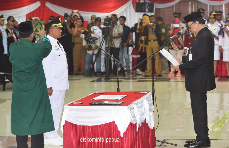 Menteri Dalam Negeri (Mendagri) Tjahjo Kumolo resmi melantik Direktur Jenderal Politik dan Pemerintahan Umum Kemendagri, Soedarmo, menjadi Penjabat Gubernur Papua, di Sasana Krida Kantor Gubernur Jayapura, Selasa (10/4).