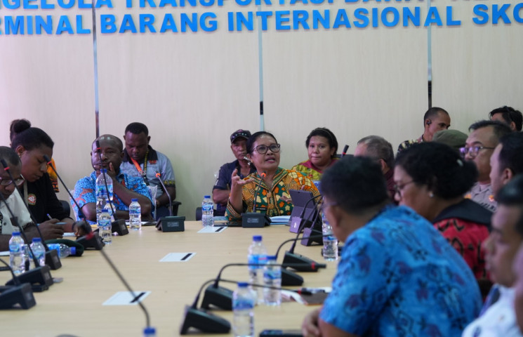 Penjabat Sekretaris Daerah (Pj) Papua, Suzana D. Wanggai, bersama Konsul RI di Vanimo, Tangkuman Alexander, memimpin rapat persiapan Border Trade Fair (BTF) 2025 yang digelar di Kantor Balai Pengelolaan Transportasi Darat (BPTD) Kelas II Papua – Terminal Barang Internasional, di Skouw Kamis (2/10/2025).