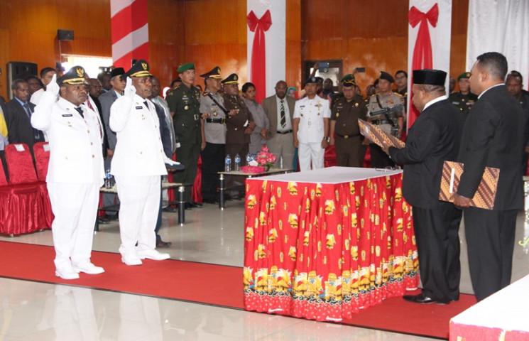 Bupati dan Wakil Bupati Puncak terpilih, Yuni Wonda dan Deinas Geley, resmi memimpin Papua lima tahun mendatang (2017 – 2022), usai dilantik Gubernur Papua Lukas Enembe,  di Sasana Kaonak Kantor Bupati Puncak Jaya, Kamis (7/12).