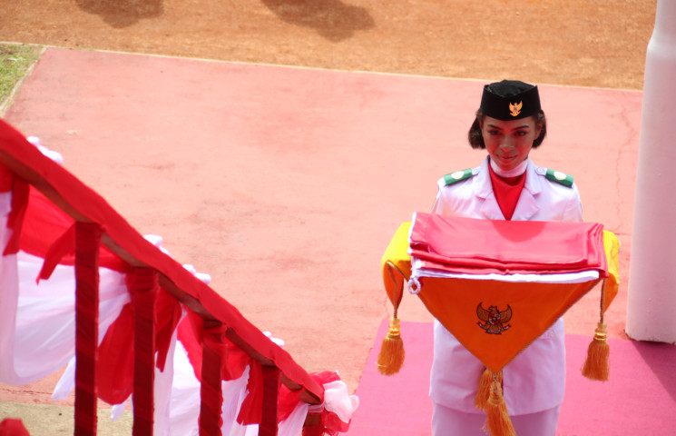 Duplikat Bendera Pusaka Merah Putih diambil oleh Shionvhory shvidarvy Sroyer Anggota Paskibra Papua 2018 yang juga merupakan pelajar SMA Negeri 3 Kota Jayapura.