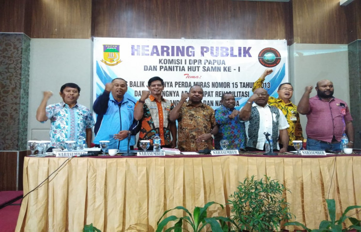 Komisi I DPR Papua bersama Panitia HUT Solidaritas Anti Miras dan Narkoba (SAMN) ke 1 Kota Jayapura menggelar Hearing Publik, terkait kilas balik jalannya Perda Larangan Miras Nomor 15 tahun 2013 dan pentingnya ada tempat rehabilitasi bagi pecandu miras dan narkoba di Provinsi Papua, yang berlangsung di Hotel Horison Jayapura, Jumat (16/11).