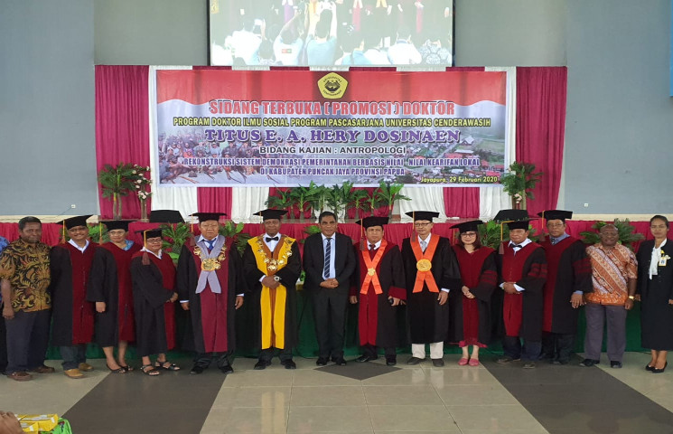 Sekda Hery Dosinaen dalam sidang tersebut membawakan disertasi dengan judul, “Rekonstruksi sistem demokrasi pemerintah berbasis nilai-nilai kearifan lokal lokal di Kabupaten Puncak Jaya Provinsi Papua”.