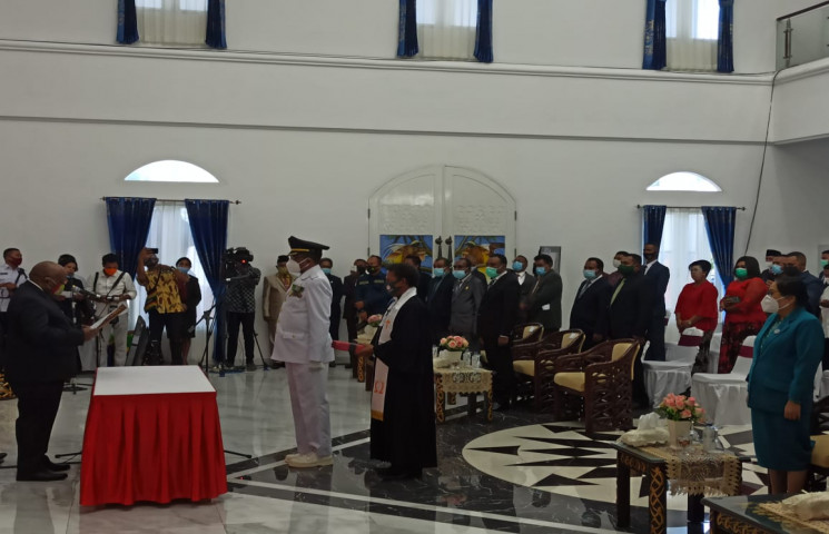 Wakil Gubernur Papua Klemen Tinal resmi melantik Leonard j. Sawerdani sebagai Wakil Bupati Sarmi, Rabu (21/10/2020) di Gedung Negara Dok V Atas Jayapura, dengan sisa masa jabatan selama dua tahun.
