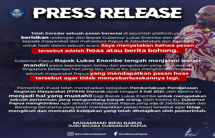 Juru Bicara Gubernur Papua Muhammad Rifai Darus memastikan pesan berantai di sejumlah platform yang berisikan undangan pertemuan Lukas Enembe dengan masyarakat dan mahasiswa Bumi Cenderawasih se-Jabodetabek/Bandung adalah hoax.