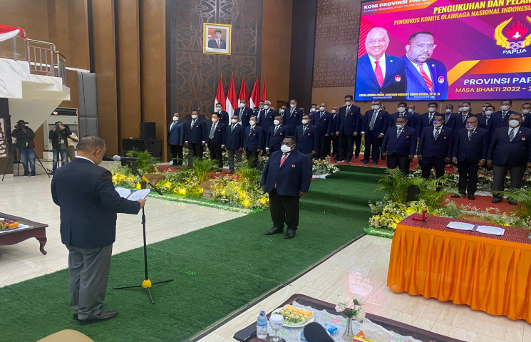 JAYAPURA - Kepengurusan Komite Olahraga Nasional Indonesia (KONI) Provinsi Papua masa bhakti 2022-2026, resmi dikukuhkan pada Jumat (15/7/2022), di Sasana Krida Kantor Gubernur Papua Dok II, Kota Jayapura.