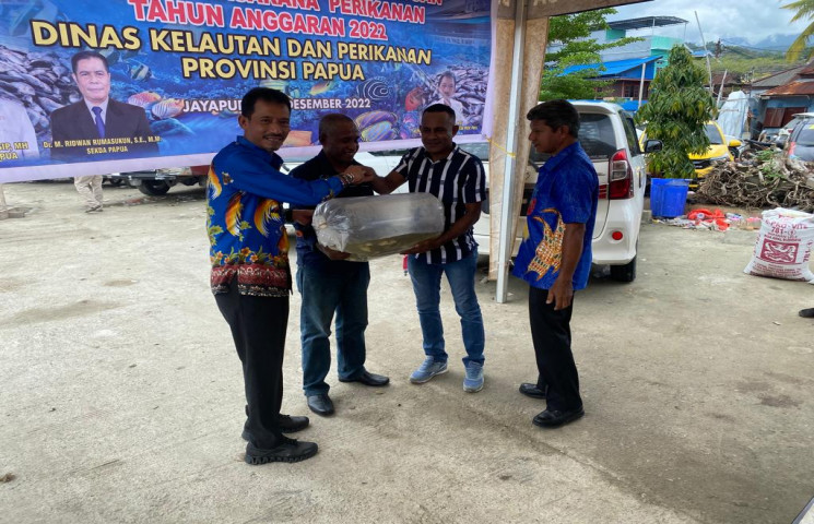 JAYAPURA - Dinas Kelautan dan Perikanan (DKP) Papua di penghujung tahun 2022, menyerahkan paket bantuan sarana prasarana perikanan kepada kelompok usaha maupun pihak terkait di PPI Hamadi, Kota Jayapura, Kamis (29/2/2022).