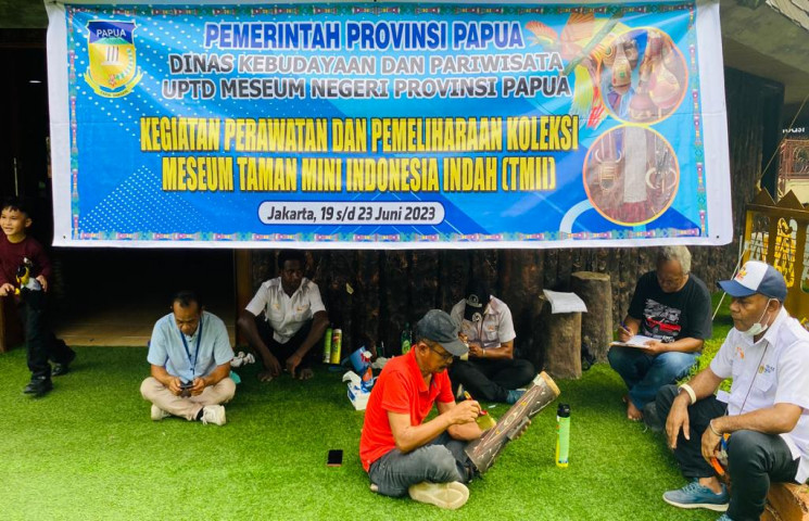 JAKARTA - Dinas Kebudayaan dan Pariwisata Papua melalui UPTD Museum Negeri bekerjasama dengan UPTB Anjungan Papua, Badan Penghubung Daerah Papua di Jakarta, melakukan perawatan dan pemeliharaan Koleksi Museum yang ada di anjungan Papua di Taman Mini Indonesia Indah (TMII) Jakarta.