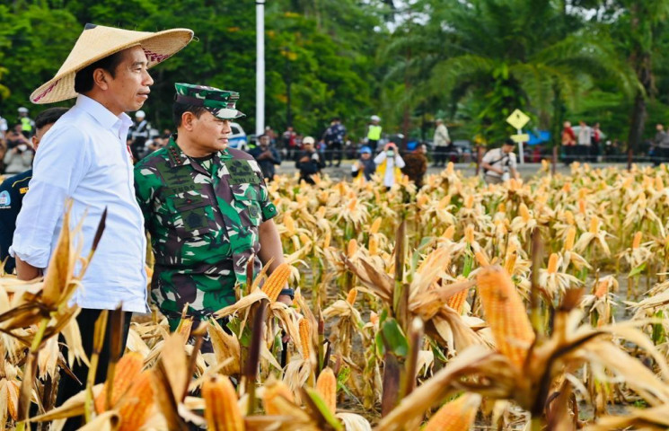 JAYAPURA - Presiden Joko Widodo meninjau langsung ladang jagung yang ditanam olehnya tiga bulan lalu, di kawasan food estate, Kampung Wambes, Distrik Mannem, Kabupaten Keerom, Provinsi Papua, pada Kamis petang (6/7/2023).