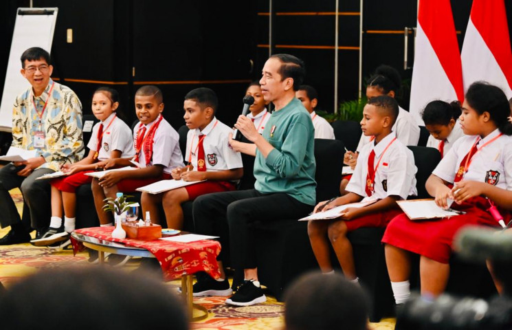 Pujian Jokowi terlontar saat bertemu 100 siswa Sekolah Dasar (SD) dari tujuh kabupaten di Tanah Papua, Jumat (7/7/2023), di Kota Jayapura.