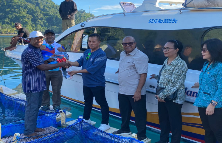 SERUI - Penjabat Gubernur Papua Muhammad Ridwan Rumasukun dalam kunjungan kerja hari kedua di Kabupaten Kepulauan Yapen, Kamis (19/10/2023) pagi, menyerahkan bantuan di Keramba Jaring Apung, Kabuena, Distrik Yapen Selatan, Serui.