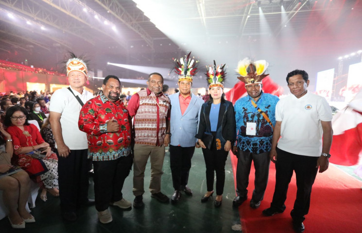 JAKARTA – Pj Gubernur Papua M Ridwan Rumasukun didampingi Pj Sekda Papua Derek Hegemur memimpin langsung kontingen Bumi Cenderawasih pada Pembukaan Pesta Paduan Suara Gerejani Katolik (Pesparani) Tingkat Nasional III, yang dihelat di Beach City International Stadium Ancol, DKI Jakarta, Sabtu malam (28/10/2023).