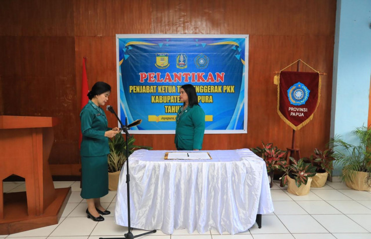 JAYAPURA - Penjabat Ketua TP PKK Papua Linda Onibala melantik Penjabat Ketua TP PKK Kabupaten Jayapura, Elphyna Situmorang, pada Kamis (9/11/2023), di Aula Dinas Kelautan dan Perikanan Papua, Kota Jayapura.