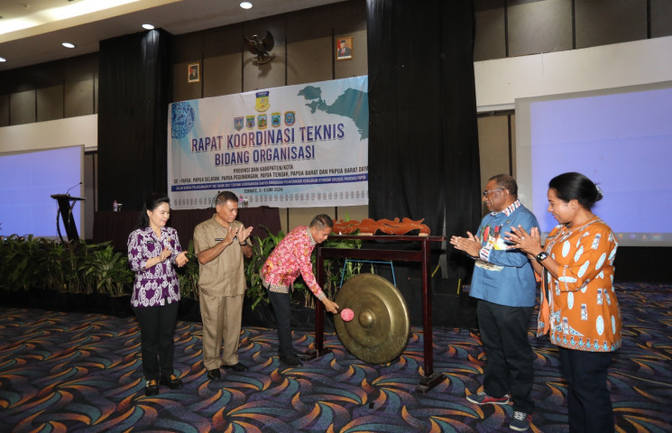 TERNATE - Penjabat Gubernur Papua Muhammad Ridwan Rumasukun membuka secara resmi Rapat Koordinasi Teknis Bidang Organisasi, di Kota Ternate, Senin (3/6/2024).