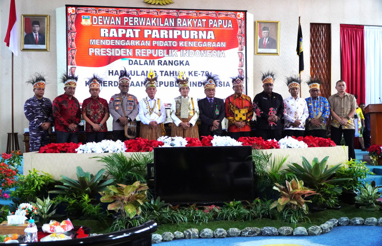 JAYAPURA - Pj. Gubernur Papua Mayjen TNI (Purn) Ramses Limbong, S.IP., M.Si. menghadiri Rapat Paripurna dengan agenda mendengarkan agenda Pidato Kenegaraan yang disampaikan oleh Presiden Republik Indonesia Ir. Joko Widodo, Jumat 16 Agustus 2024.