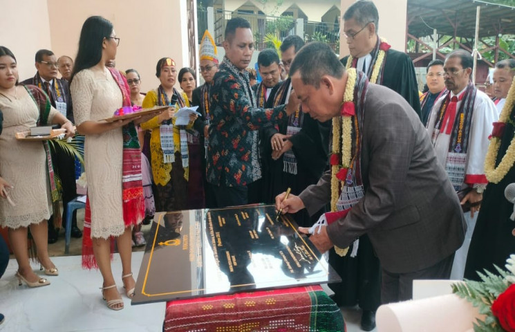 JAYAPURA - Penjabat Gubernur Papua Ramses Limbong, meresmikan HKBP Rogate, Resort Papua, Distrik XVII Indonesia Bagian Timur, Minggu (25/8/2024).