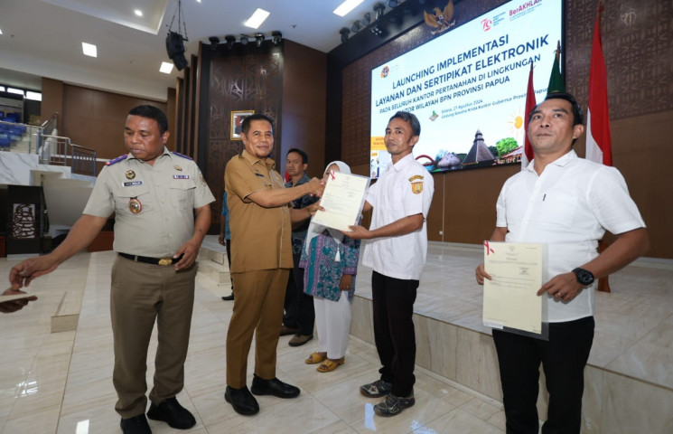 “Karena itu kita mengimbau kepada masyarakat setempat untuk melakukan pengalihan sertifikat tanah ke elektronik. Pengalihan ini lebih aman dan tidak bisa rusak selain itu juga untuk mengurangi penggunaan kertas," kata Sekda Papua Ridwan Rumasukun usai melauncing implementasi layanan dan sertifikat elektronik pada seluruh Kantor Pertanahan di Provinsi Papua bertempat Aula Sasana Krida, Selasa (27/8/2024).
