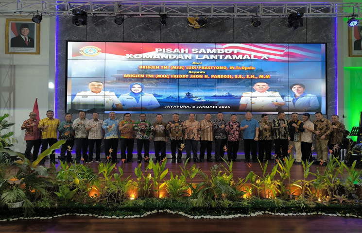 JAYAPURA - Penjabat Gubernur Papua Ramses Limbong hadir mengikuti acara pisah sambut Komandan Lantamal X di Gedung Negara Dok V Jayapura, Rabu 8 Januari 2025.