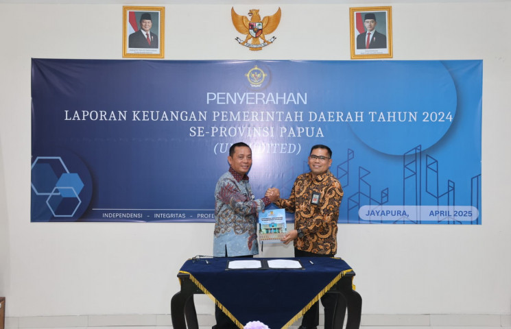 JAYAPURA - Pemerintah Provinsi Papua secara resmi menyerahkan Laporan Keuangan Pemerintah Daerah (LKPD) Tahun Anggaran 2024 kepada Badan Pemeriksa Keuangan (BPK) Perwakilan Papua, Rabu (9/4/2025), di Jayapura.