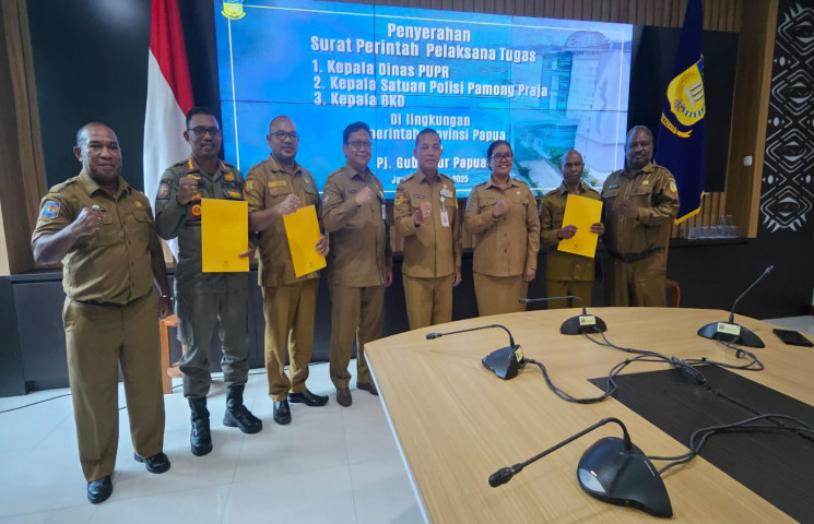 Penjabat Gubernur Papua, Ramses Limbong, menyerahkan langsung surat penugasan kepada Robert Awi sebagai Plt Kepala Dinas Pekerjaan Umum dan Penataan Ruang (PUPR), Orgenes Kambuaya sebagai Plt Kepala Badan Kepegawaian Daerah (BKD), serta Urip Supriadi Sukirno sebagai Plt Kepala Satuan Polisi Pamong Praja (Satpol PP).