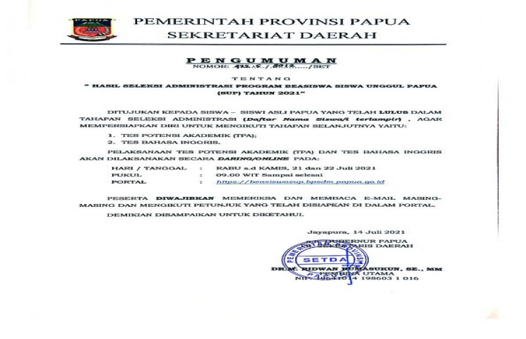 That is as the announcement of the results of administrative tests signed by the Acting Regional Secretary, DR.M Ridwan Rumasukun, SE, MM on behalf of the Governor of Papua, Lukas Enembe, SIP, MH, with the letter number: 422.5/8012/SET on the Administrative Selection Results of the Papua Superior Student Scholarship Program (SUP) in 2021.