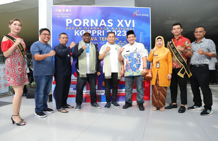 Governor Ridwan attends the opening of the 2023 Korpri XVI National Sports Week (Pornas), in Semarang, Central Java. Upon arrival at General Ahmad Yani International Airport, Governor Ridwan and his entourage who were present accompanied by Papua Regional Secretary Derek Hegemur, were immediately welcomed by local government representatives.